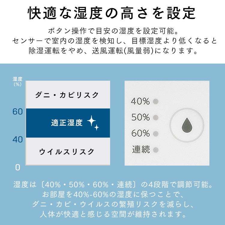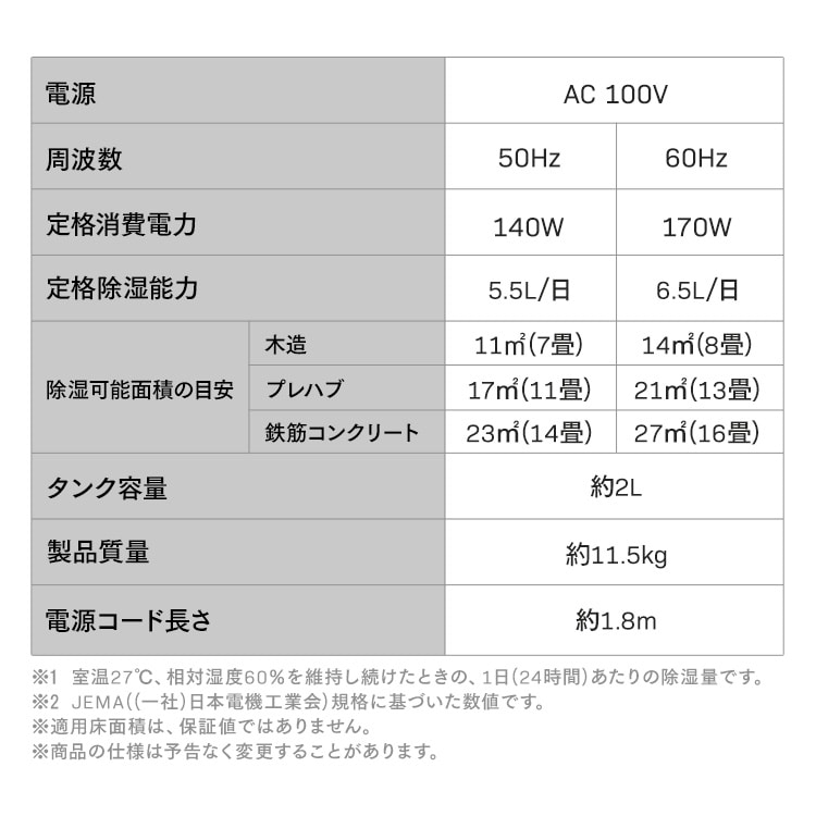 ※室温27℃、湿度60%を維持し続けたときの1日(24時間)あたりの除湿量です。