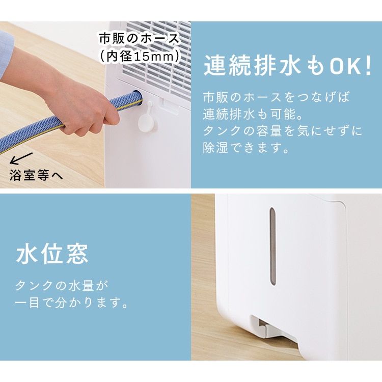 ※市販のホース(内径15mm)を接続して排水すると、水タンクの容量を気にすることなく連続で除湿できます。