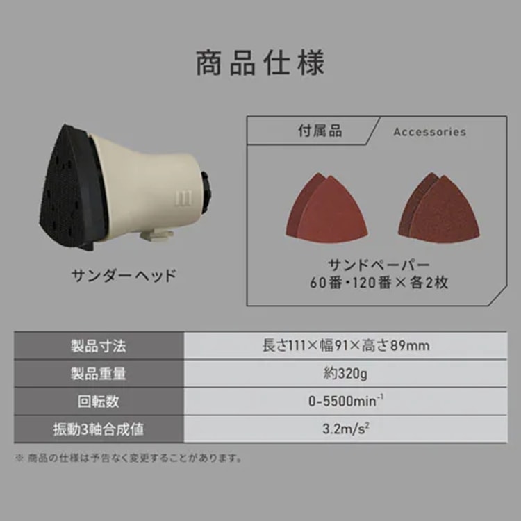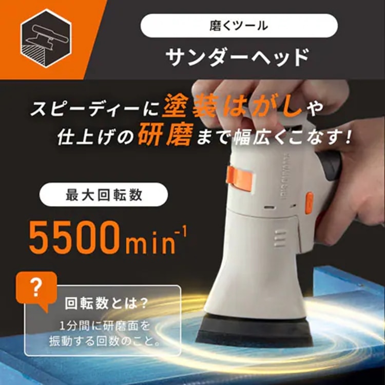 最大振動数5500rpmで塗装剥がしや仕上げの研磨まで幅広く。