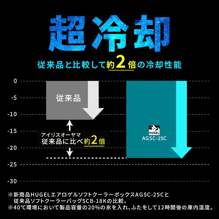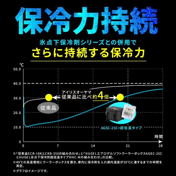 (※本体容量40%相当の氷を入れ、底面温度が8℃に達するまでの時間。環境温度:30℃→9時間・20℃→15時間の繰返し。)