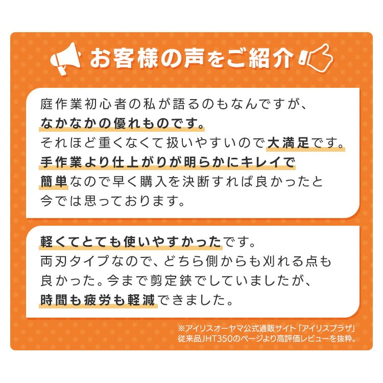 コンパクトなブレード“刈り込み幅:約350mm”で、小回りが利いて初心者の方でも扱いやすいです。