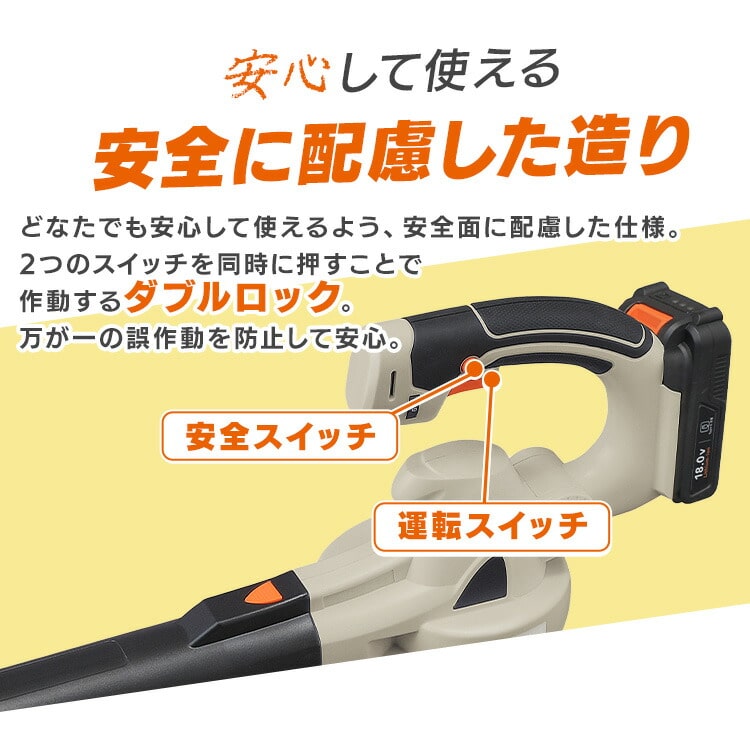 安全スイッチと運転スイッチを同時に押すことで作動する「ダブルロック」で、万が一の誤作動を防止します。