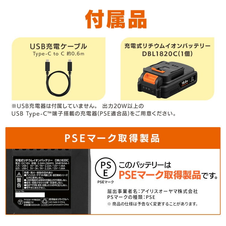充電式リチウムイオンバッテリー(型番:DBL1820C)、USB充電ケーブル(Type-C to C)