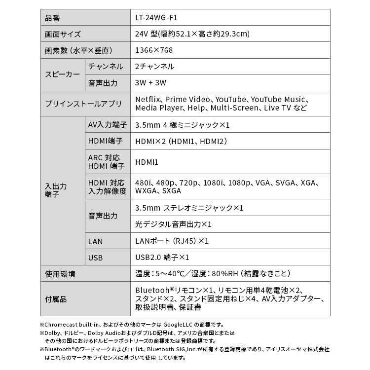 ![[マイル5倍!12/7迄][公式]テレビ 24V型 Google チューナーレスTV LTL-24WG-F1 ブラック アイリスオーヤマ[安心延長保証対象]](/img/0119/goods/D5/0119-111318.jpg)