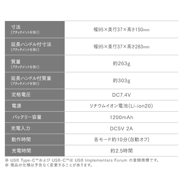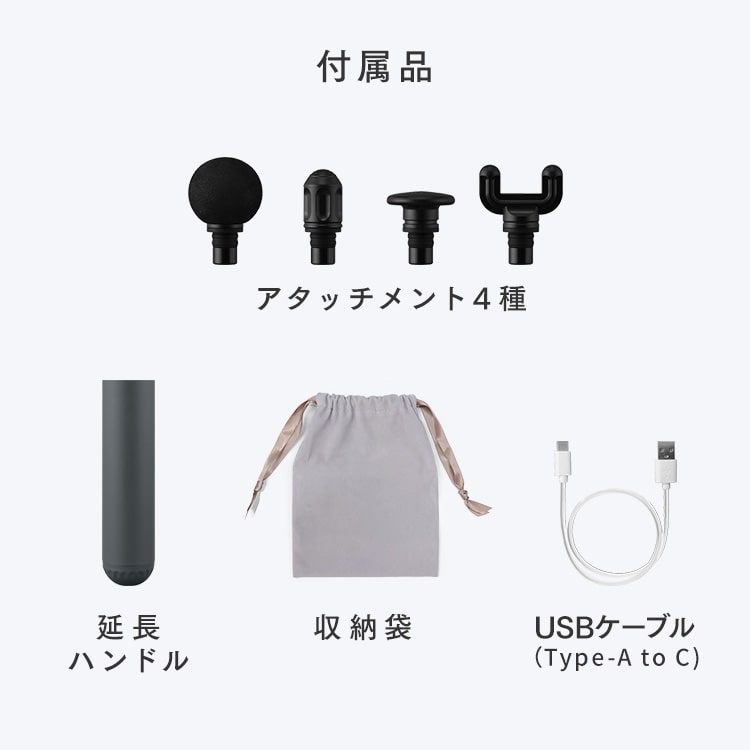 アタッチメント×4、USBケーブル、延長ハンドル、収納袋