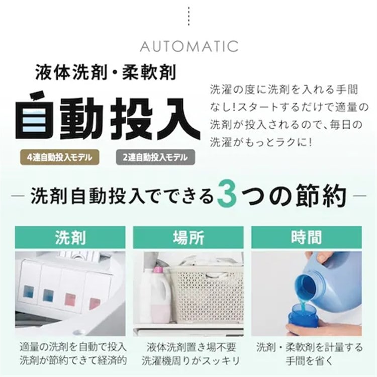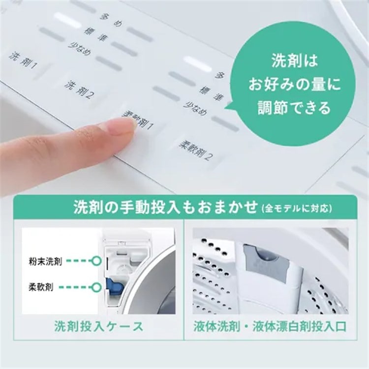 液体洗剤や柔軟剤の最適な量を自動で計量・投入します。