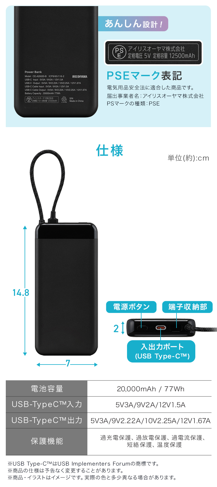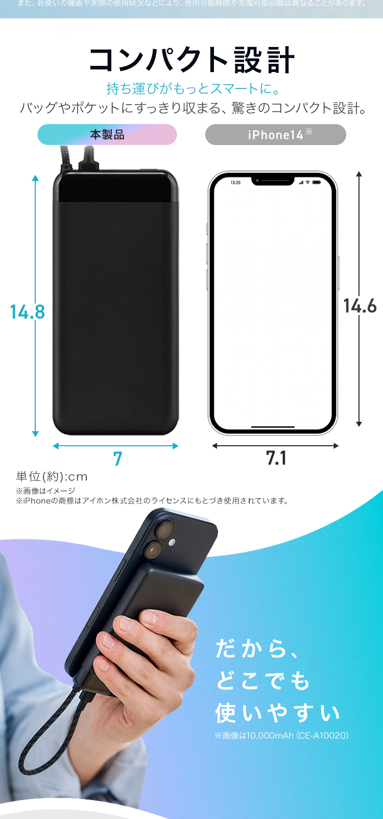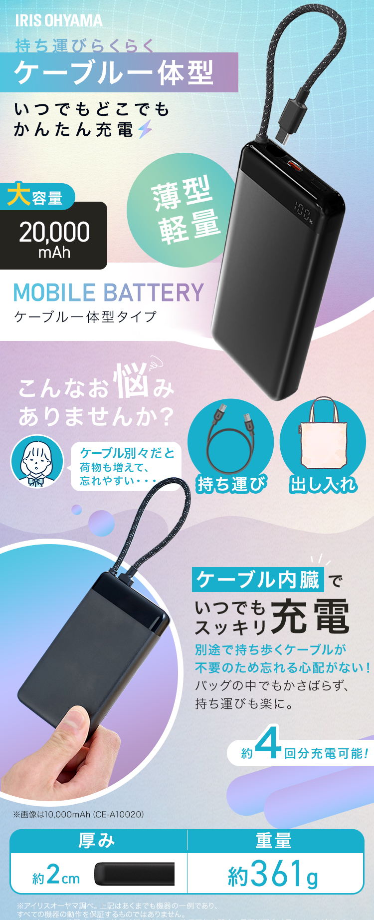 薄型&軽量モデル・USB Type-C(TM)※ケーブル一体型で持ち運びもスマートなモバイルバッテリーです。