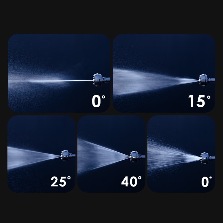 5in1ノズルは、5通りの噴射(0°/15°/25°/40°/0+)に切り替えができます。