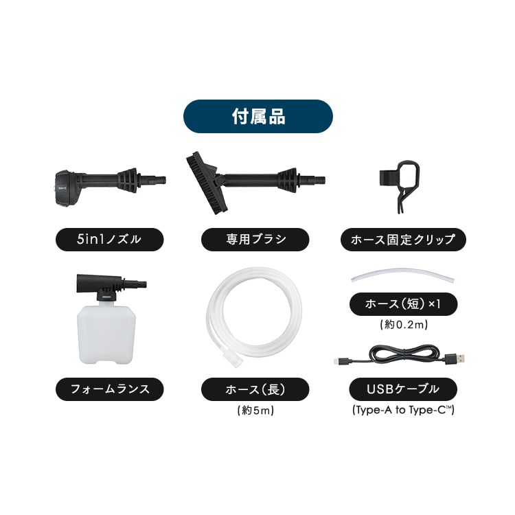5in1ノズル、フォームランス、ブラシノズル、ホース固定用クリップ、ホース用フィルター、USB充電ケーブル(約1m)、ホース×2(短:約0.2m/長:約5m)