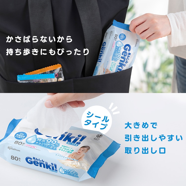 (検索用:おしりふき・薄手・80枚入・純水99%・水分たっぷり・無香料・ノンアルコール・保湿成分配合・赤ちゃん・ベビー・持ち運び・おでかけ・手口ふき・ウェットティッシュ・おしり拭き・お尻拭き・Genki・ふつうサイズ・4967576792189・アイリスオーヤマ)