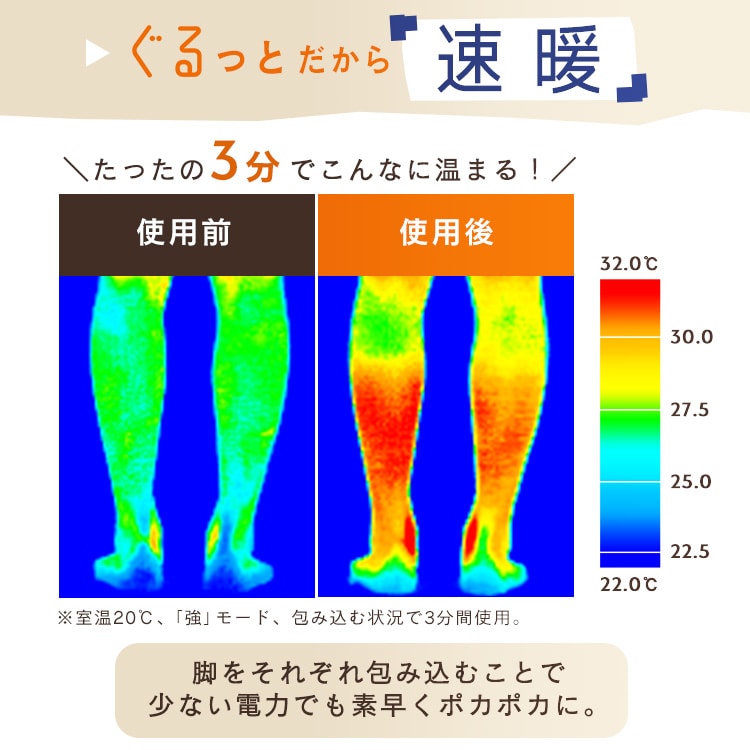 3:足をそれぞれ包み込んで閉じる/少ない電力でも素早くふくらはぎまでポカポカに!