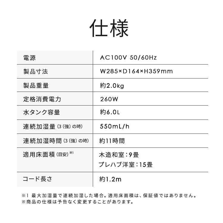 【タンク容量6L】【加湿量550mL/h】【適用床面積約15畳※】