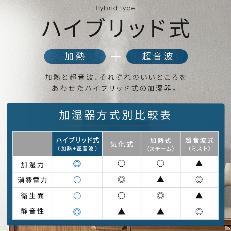 超音波式と加熱式、それぞれのいいところをあわせたハイブリッド式の加湿器。