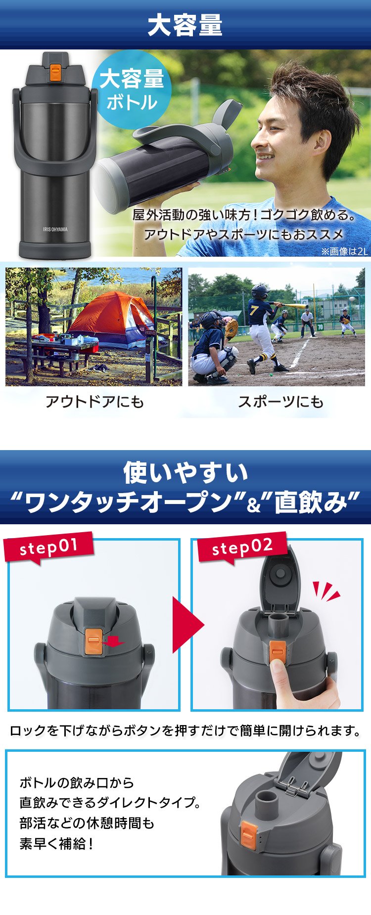 そのまま飲める直飲みタイプで、スポーツやアウトドアの水分補給に最適なスポーツジャグです。