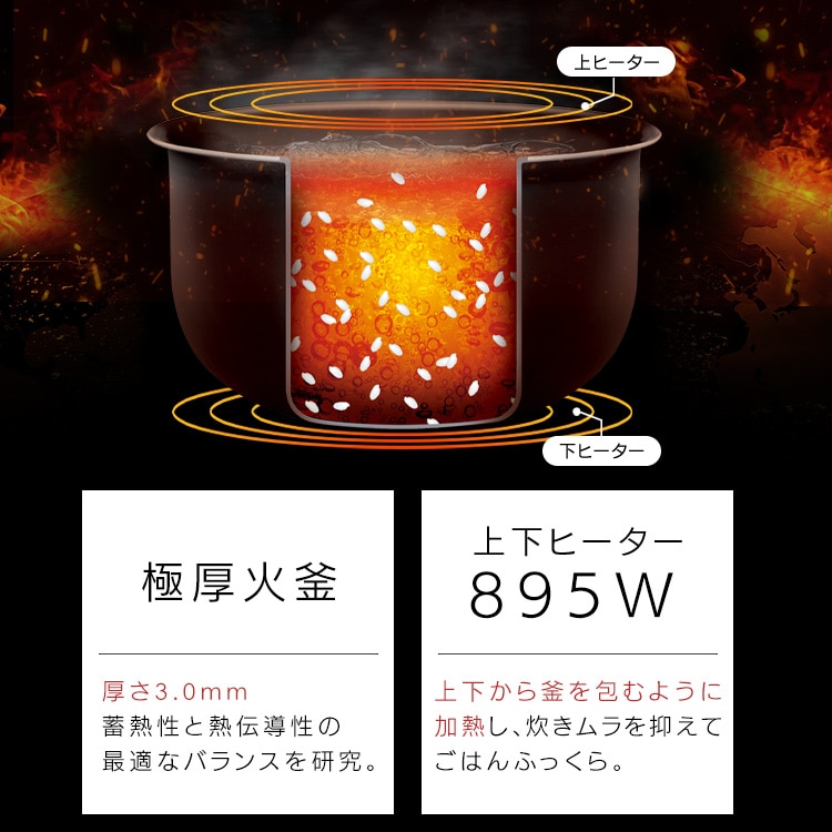 底(860W)+蓋ヒーター(35W)で釜全体を加熱します。