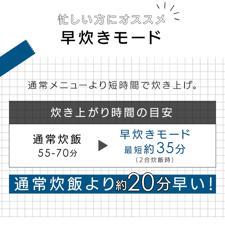 炊飯メニューは(白米、早炊き、エコ、炊込み、おかゆ、玄米)です(無洗米も白米メニューで炊飯できます)。