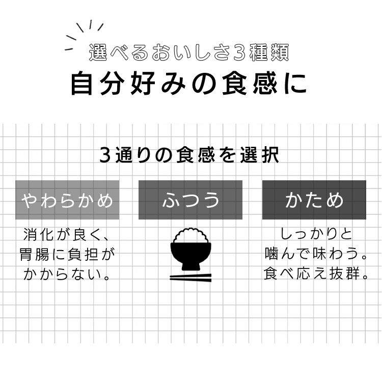 お好みに合わせて白米のごはんの食感(ふつう/かため/やわらかめ)を調節できます。