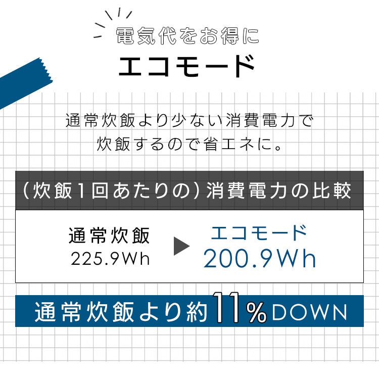 ※家庭用品品質表示法にもとづく「電気ジャー炊飯器」の省エネ法関連表示です。蒸発水量は、1回あたりの炊飯時に炊飯器の外に放出した水の質量で、省エネ法の目標基準値を算出するために用いる数値です。白米の省エネメニューで計測。