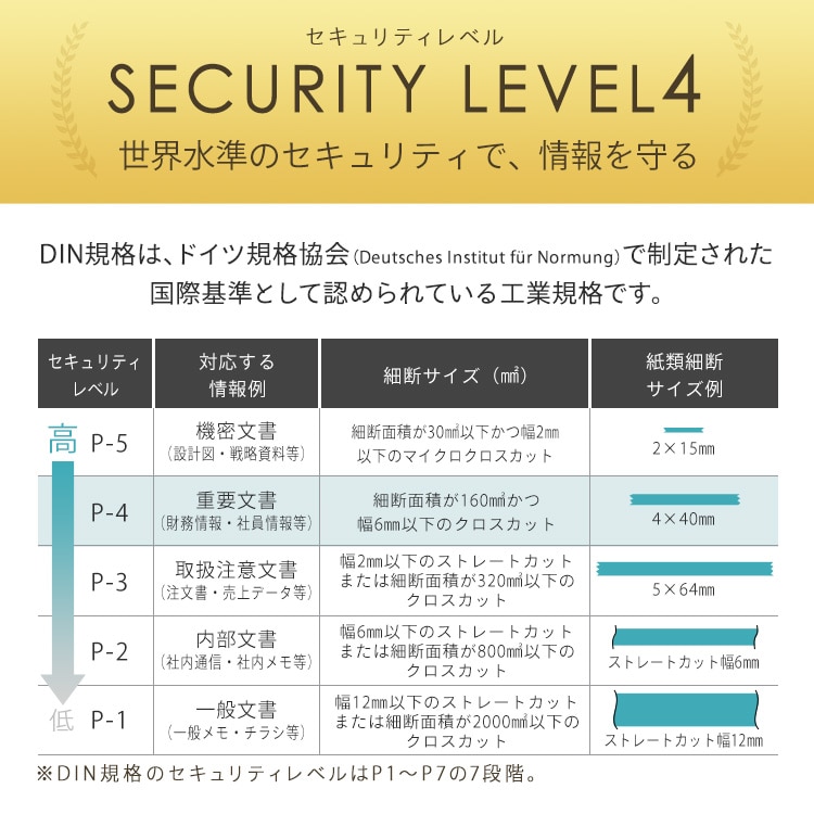クロスカットタイプで、細断サイズが約5×約18mmと細かくカット。機密情報のセキュリティにおすすめです。