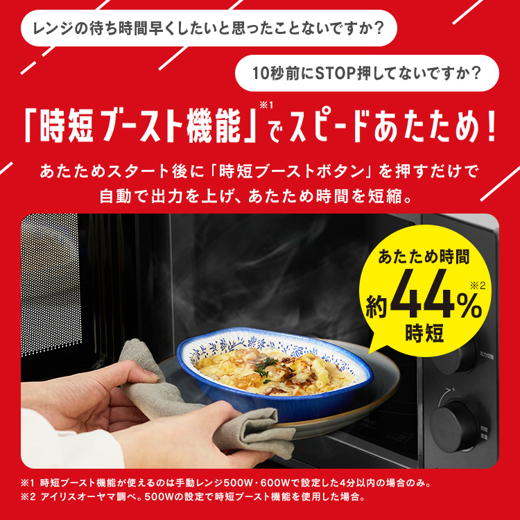 出力と時間をセットして「時短」ボタンを押すだけで、温め時間を短縮。