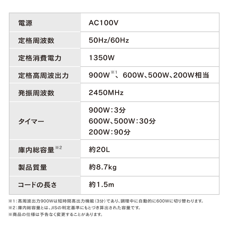 ※1 高周波出力900Wは短時間高出力機能(3分)であり、調理中に自動的に600Wに切り替わります。
