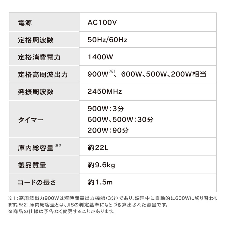 ※1 高周波出力900Wは短時間高出力機能(3分)であり、調理中に自動的に600Wに切り替わります。