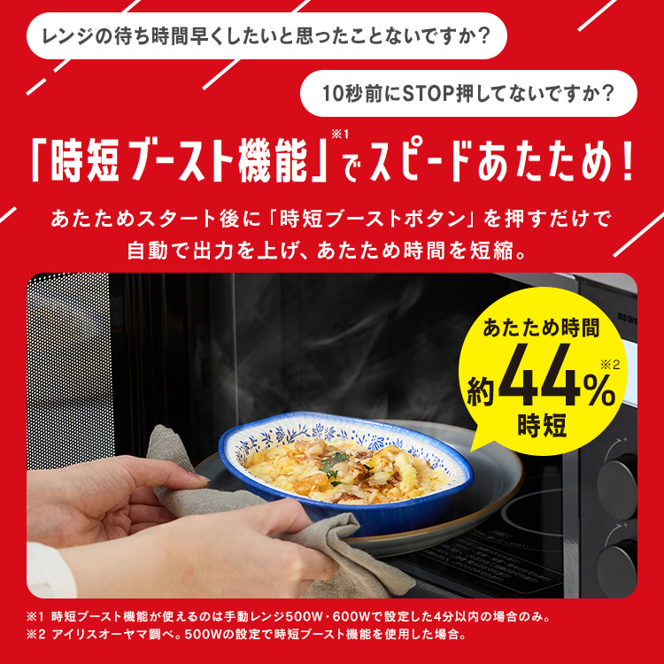 出力と時間をセットして「時短」ボタンを押すだけで、温め時間を短縮。