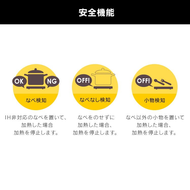 ・なべなし検知機能/小物検知機能:使えないなべを置いて加熱をした場合、なべを載せないで加熱をした場合、スプーンなどなべ以外の小物を置いて加熱をした場合、エラーを表示して加熱を停止します。