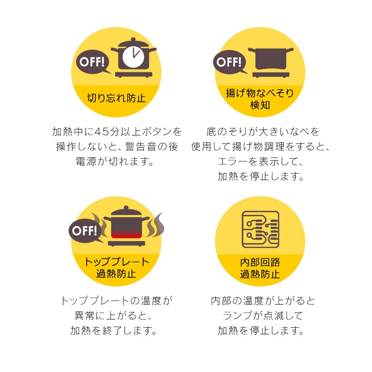 ・トッププレート過熱防止機能:トッププレートの温度が上がると、エラーを表示して加熱を停止します。