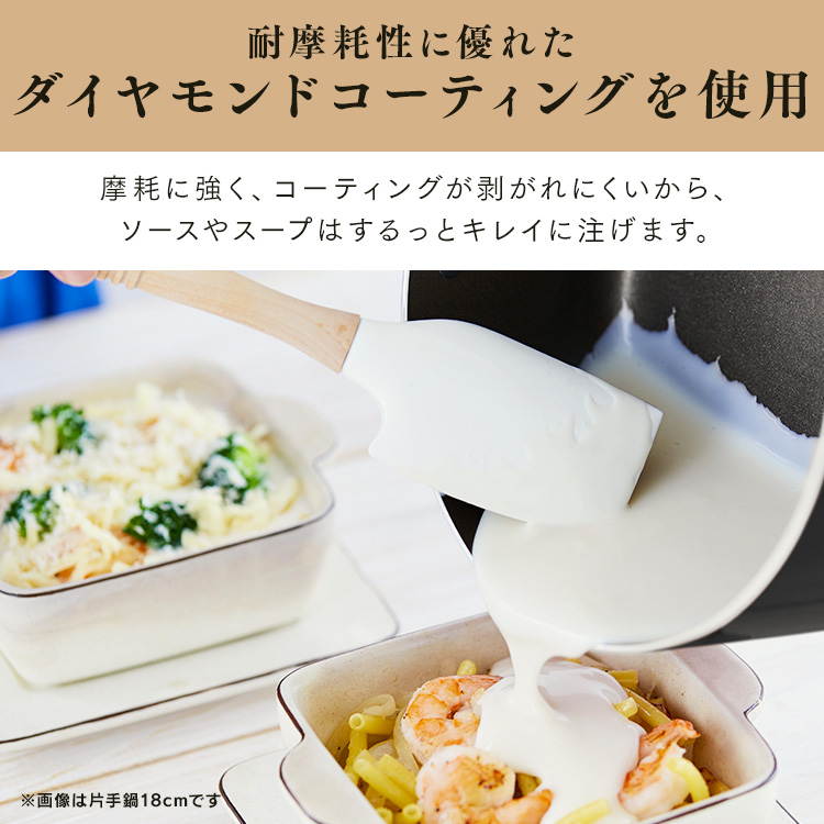 ダイヤモンドコーティングを使用した、こびりつきにくく丈夫で長持ちするなべです。