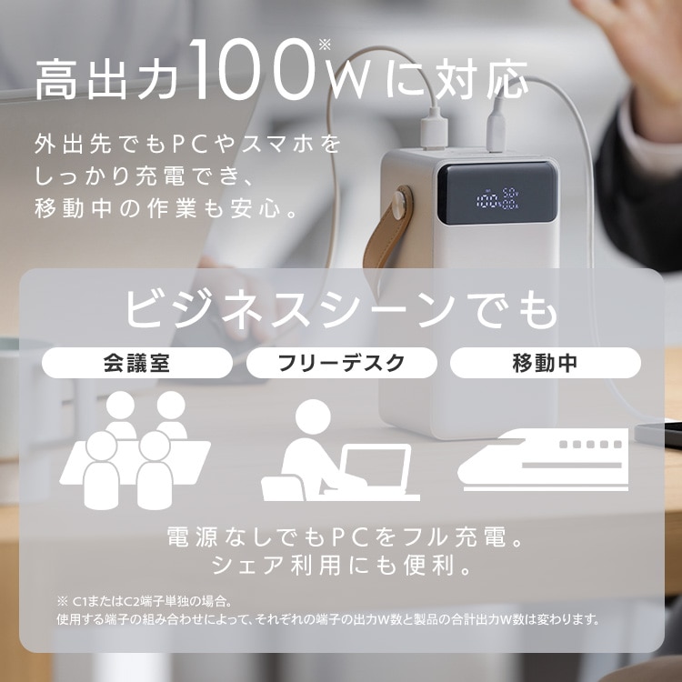 ノートパソコンの充電も可能な高出力なので、電源供給のないカフェなどでも一日中作業が可能です。