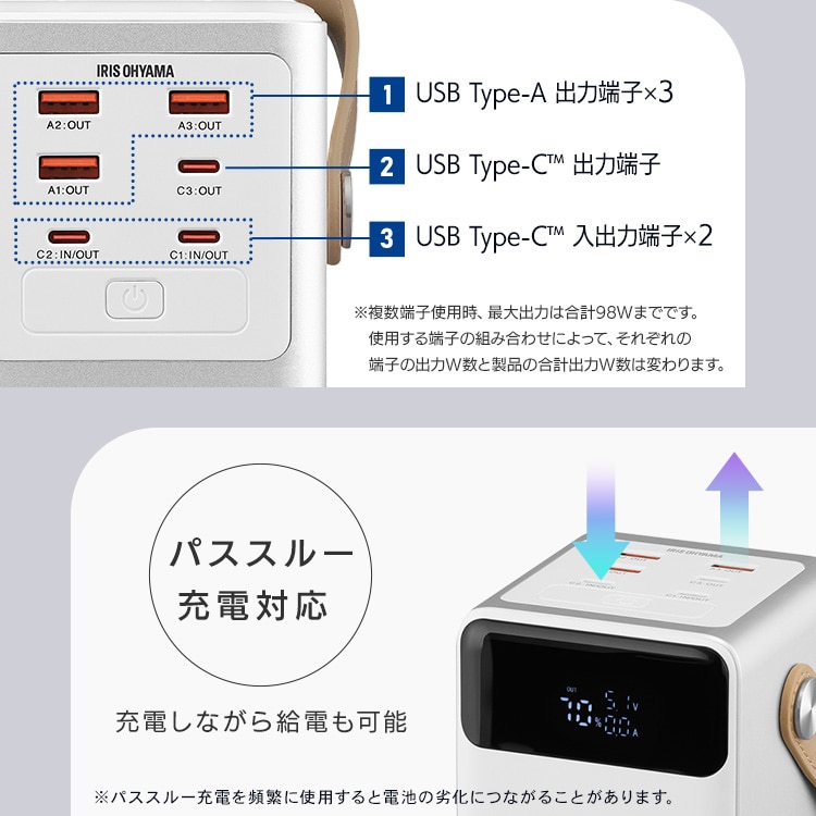 ※1 約3000mAhのスマートフォンを1日1回0%から100%まで充電した場合、約12回充電可能(アイリスオーヤマ調べ)。