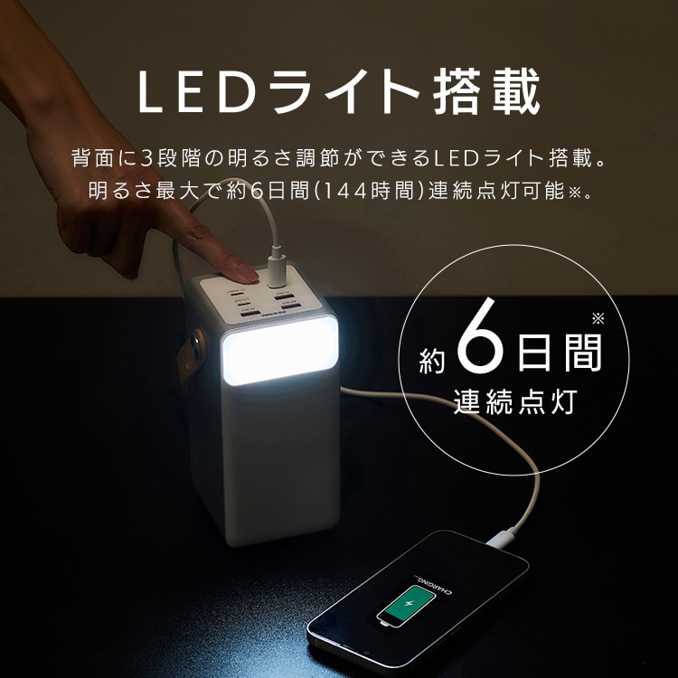 ライトのみの使用で6日間(約144時間)点灯可能で、3段階調光のLEDライトを背面に搭載。