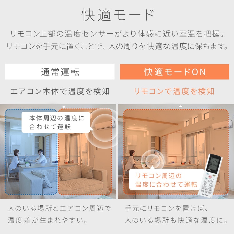 『快適モード』に設定しておくと、リモコンに搭載されている温度センサーでも室温を管理するので、足元の冷えが気になる冬場でも設定温度に到達しどこでも暖かく快適です。(暖房時)