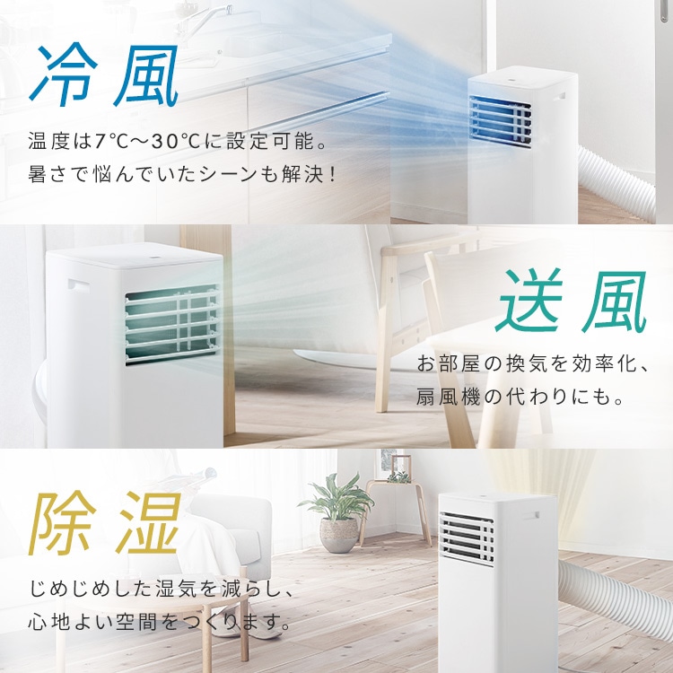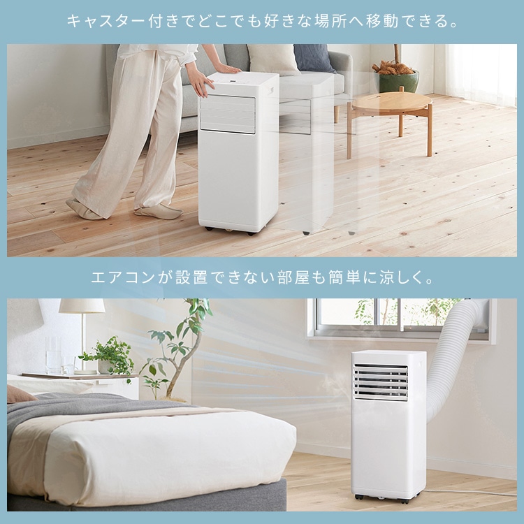 取付工事が不要で、エアコン配管穴が無く設置が難しい場所(キッチンやガレージなど)に、誰でも簡単に設置できる移動式エアコンです。