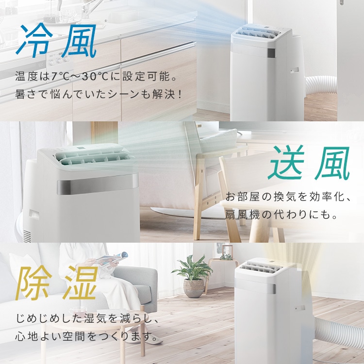取付工事が不要で、エアコン配管穴が無く設置が難しい場所(キッチンやガレージなど)に、誰でも簡単に設置できる移動式エアコンです。