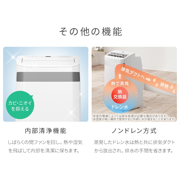 ※1 ノンドレン方式は冷風・除湿運転時のみです。湿度が高い環境では排水処理が必要になる場合がございます。