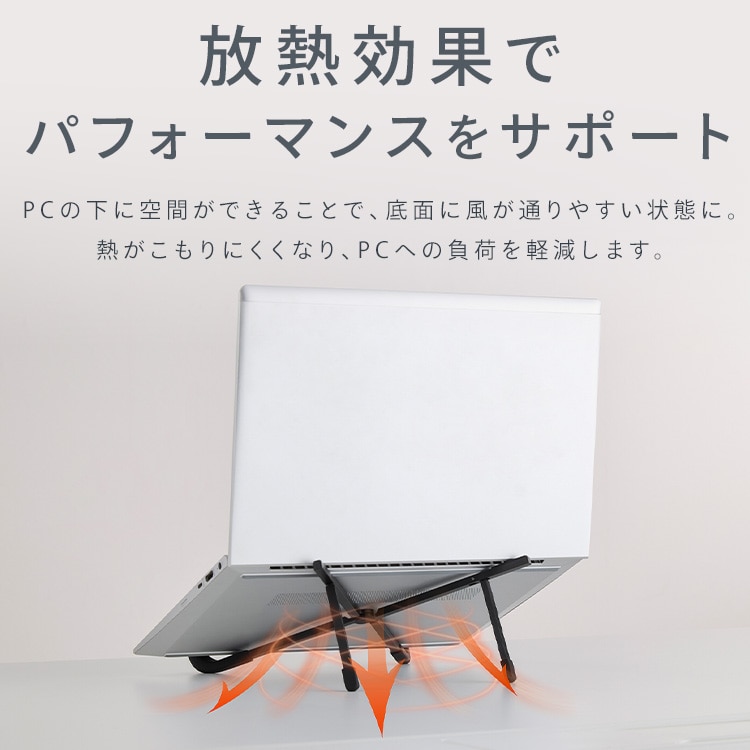 PCの下に空間が生まれることで通気性が向上し、熱がこもりにくくなるのもポイントです。
