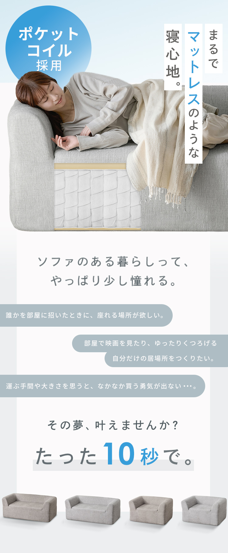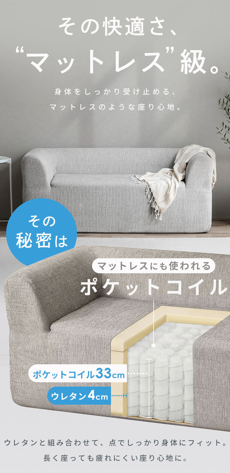 座面にポケットコイルを使用しているため、マットレス同様の上質な座り心地のソファです。
