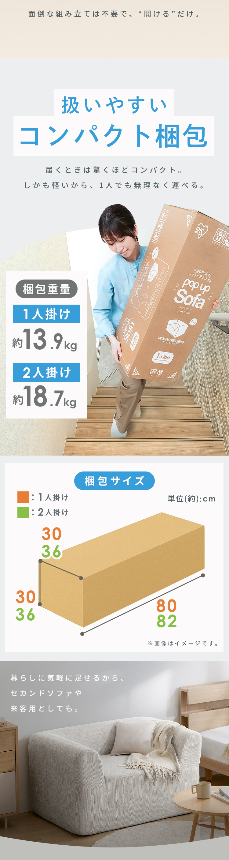 1人で持てるコンパクトな梱包サイズ。自宅の2階用のソファとしてもおすすめです。