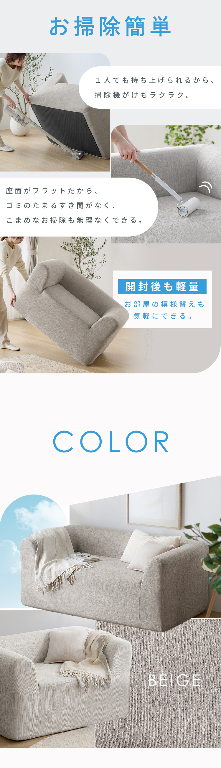 開封後も軽量なので、掃除や部屋の模様替えもスムーズ。必要な場所にサッと持ち運べ、くつろぎスペースを自由に作れます。