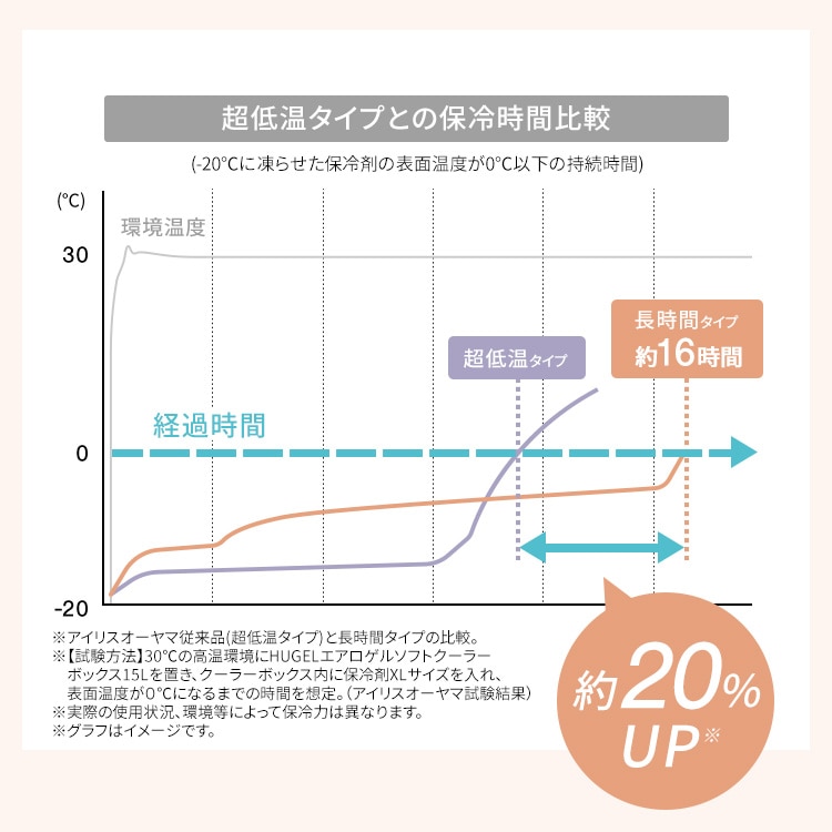 ※アイリスオーヤマ超低温タイプとの比較(エアロゲルソフトクーラーボックス15L使用時)。