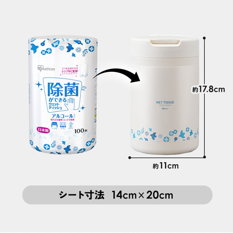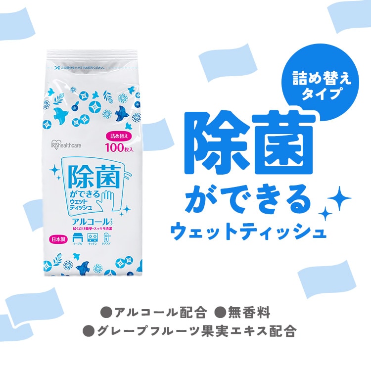 ※詰め替えの際は必ず「アイリスオーヤマ 除菌ができるウェットティッシュ アルコール ボトル」に入れてください。
