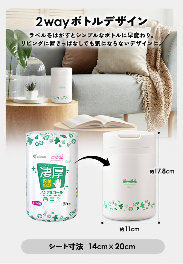 フタ付きボトルでウェットティッシュの乾燥を防ぎます。