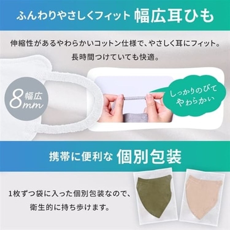 伸縮性があるやわらかいコットン仕様の幅広耳ひもが、ふんわりとやさしく耳の形にフィット。