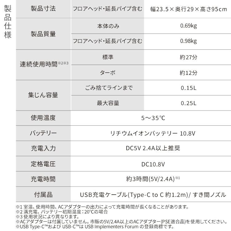 USB充電ケーブル(Type-C to C 約1.2m)、すき間ノズル