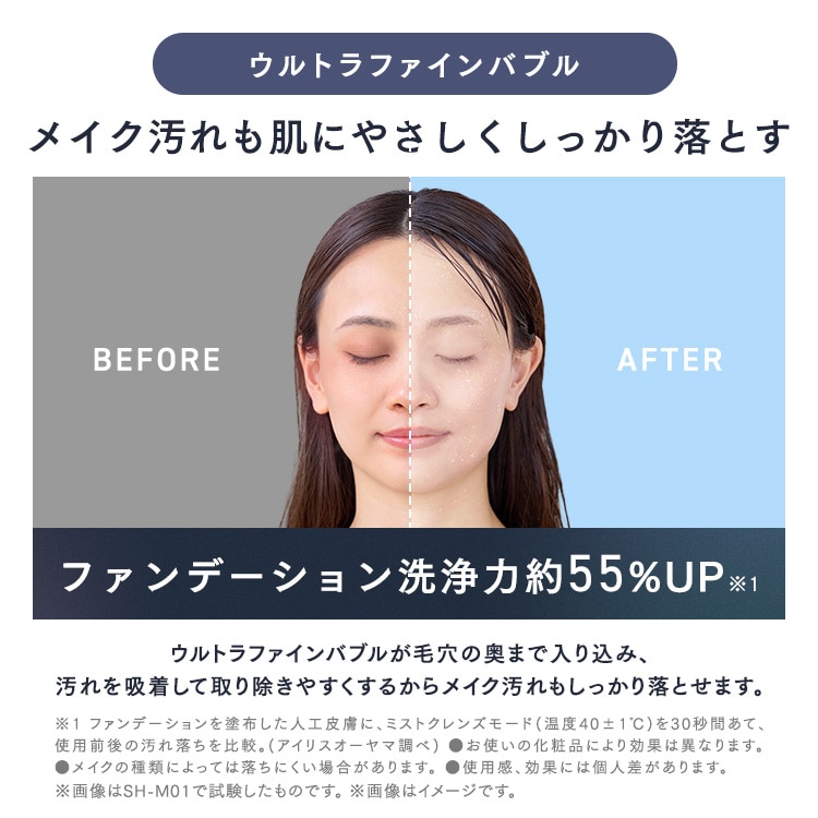 直径0.001mm未満(1μm)の超微細泡「ウルトラファインバブル」が毛穴の奥まで入り込み、汚れを吸着して取り除きやすくするのでメイク汚れもしっかり落とせます。