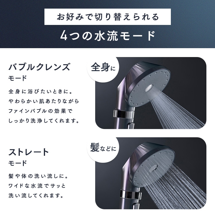 4つの水流モードを搭載[ミストクレンズ/バブルクレンズ/ストレート/ジェットクレンズ]しており、手元で簡単にお好みのモードに切り替えができます。