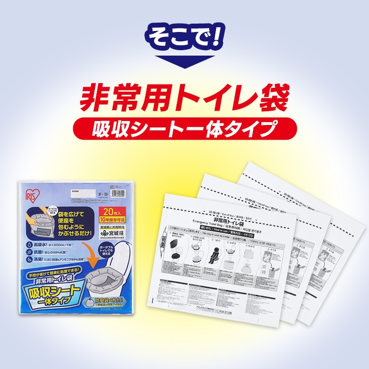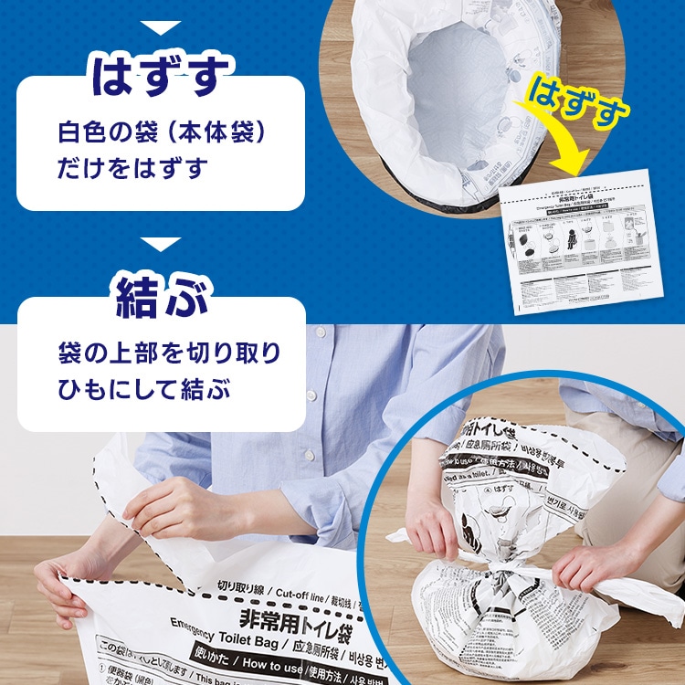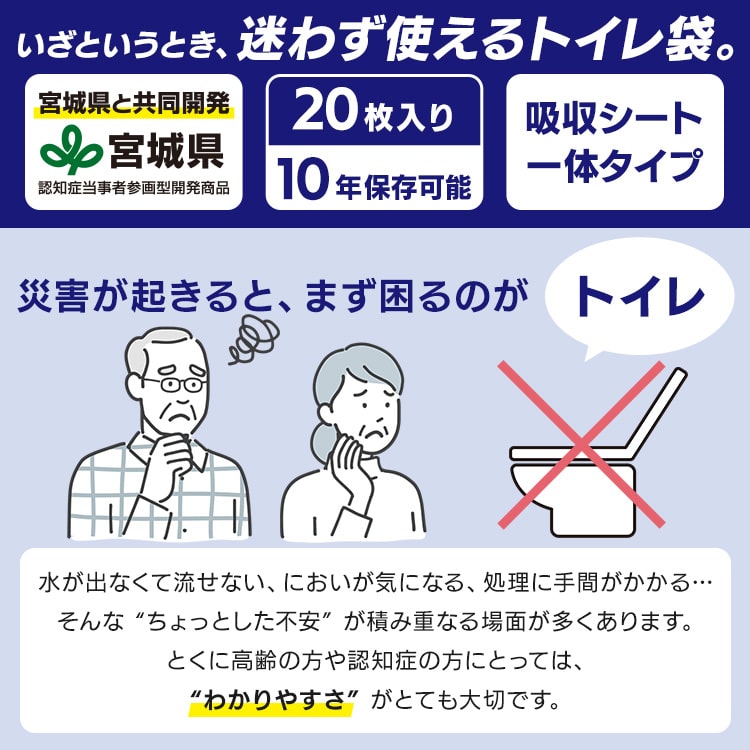 災害時や断水時などのトイレが使えない場面に加え、介護・アウトドアシーンでも役立つ非常用トイレ袋です。