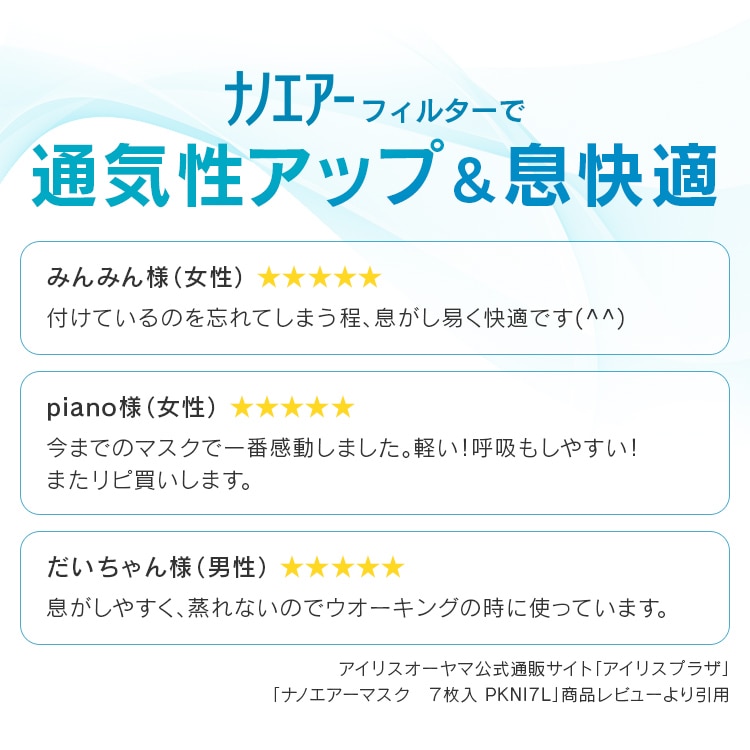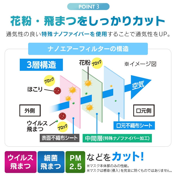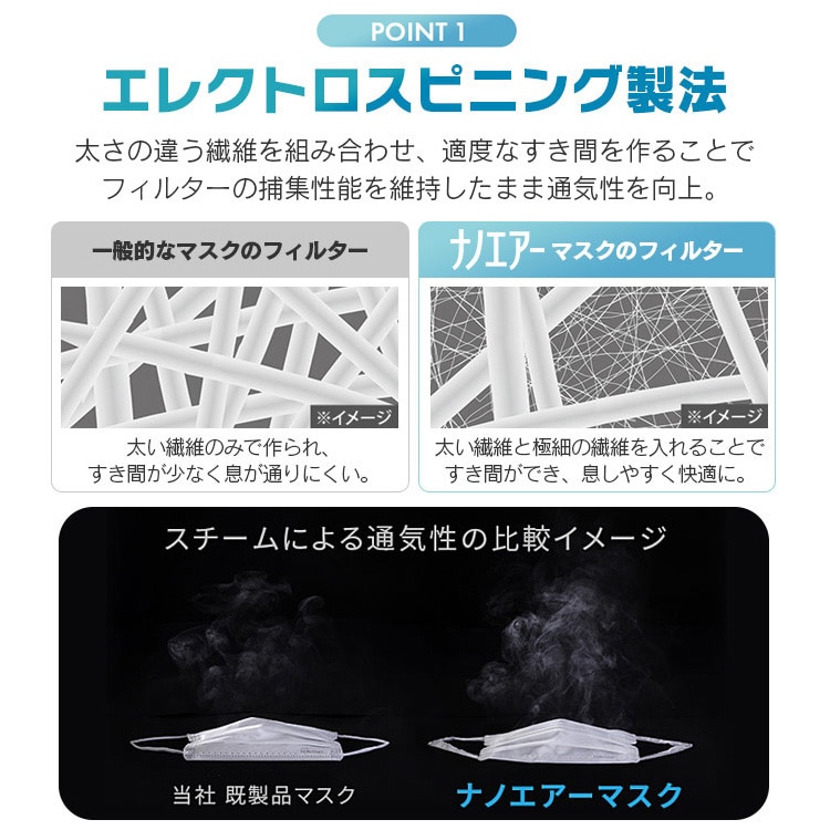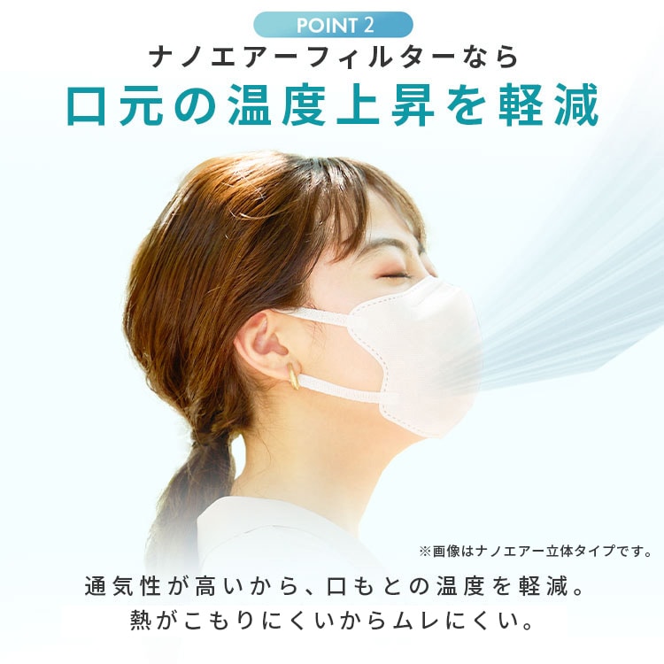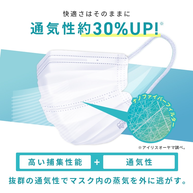 通気性の良い特殊ナノファイバーを使用することで、フィルター性能はそのままに、通気性をUPしました。